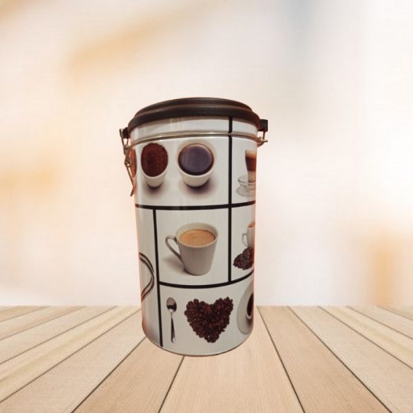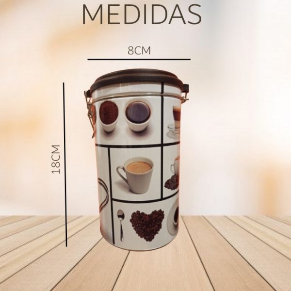 Lata de alumínio cilíndrica, com estampas de café e tampa em acetato transparente. Boa vedação, o que confere ao seu café manter aromas e refrescância. Medidas: Altura: 18cm Diametro: 8cm